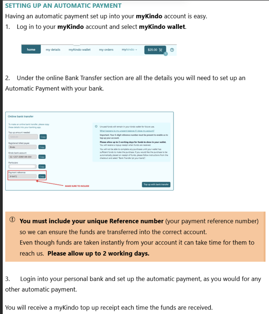 KINDO now has a new function where parents are able to set up automatic payments that best suit your budget. Please read the information below.