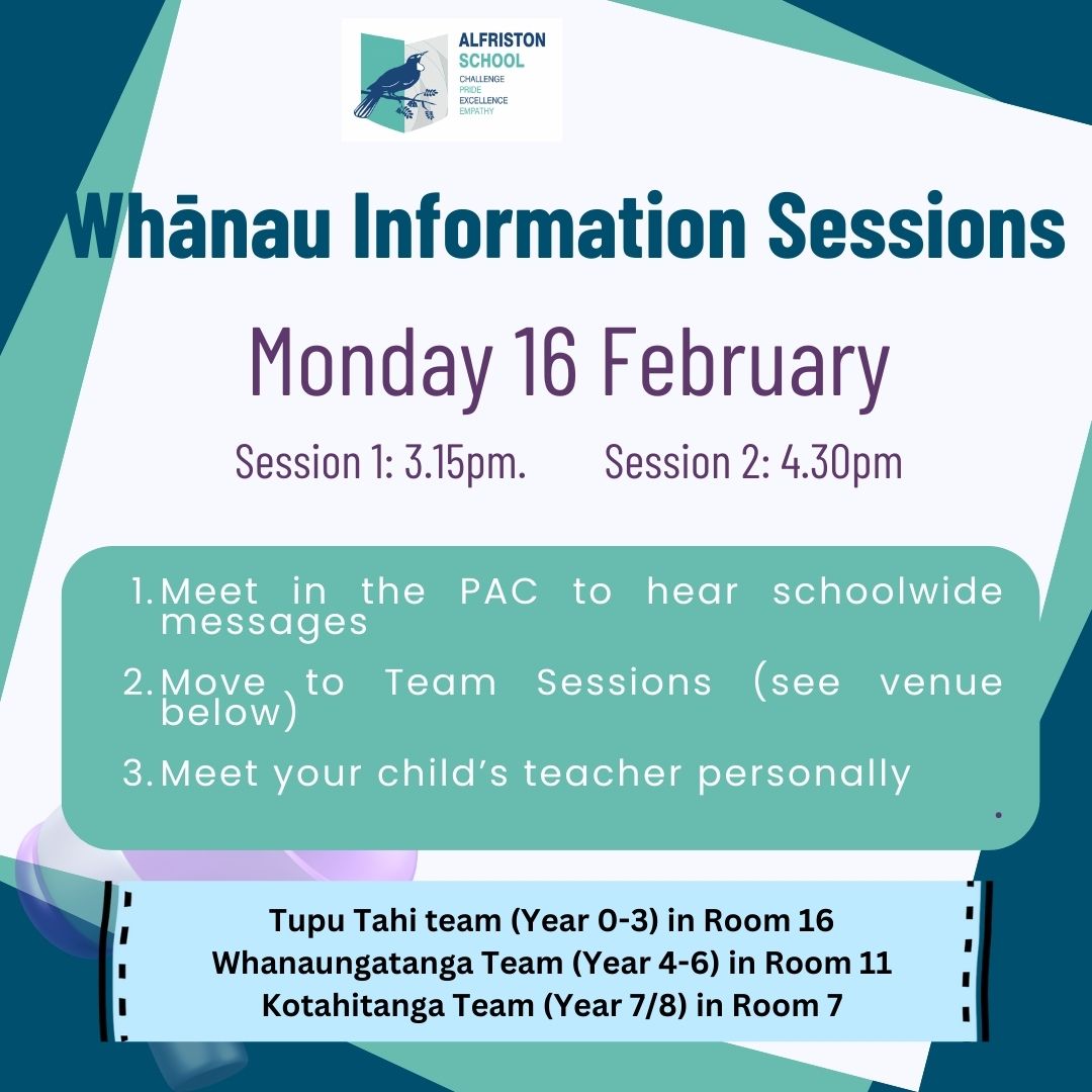 The start of the year has been fantastic and now we want to meet you to share important information and begin to develop the strong home/school partnership we know is so important. Save the date: Monday 16th February 2026 is our Whānau Information Sessions and we want to see you there 🙂 Please see the attachment for further information.